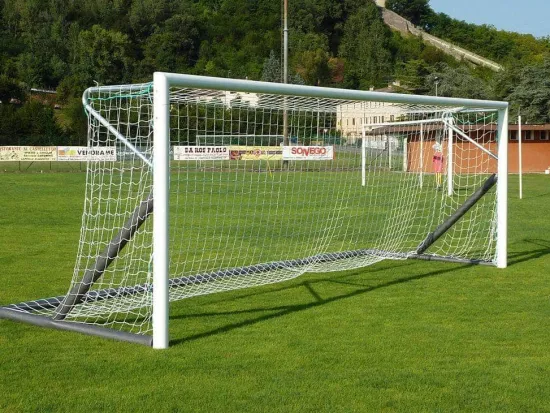 Paio porte 6×2 metri, mobili, realizzata con profilo in alluminio sezione ovale 100×120 mm. con nervature interne. Per rendere la porta ancora più stabile e robusta i gomiti sono saldati e le giunzioni sono in profilo ad alto spessore in alluminio lega speciale 6005. Reggirete a gomito in acciaio zincato a caldo, e ganci in materiale plastico per il fissaggio della rete.